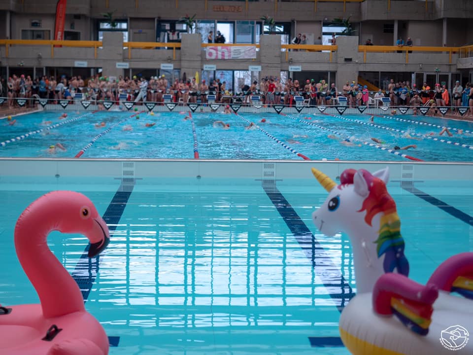 Le nombre de participant·es par équipe n’est pas limité, et bien-sûr chacun·e nage la durée ou la distance qu’elle ou il souhaite. Rassure-toi : les pauses sont évidemment autorisées, ce sera une bonne opportunité pour participer à une course de bouées endiablée, une séance d’aquagym délirante, se faire chouchouter par un.e ostéopathe ou encore prendre une part de gâteau et/ou boisson.
