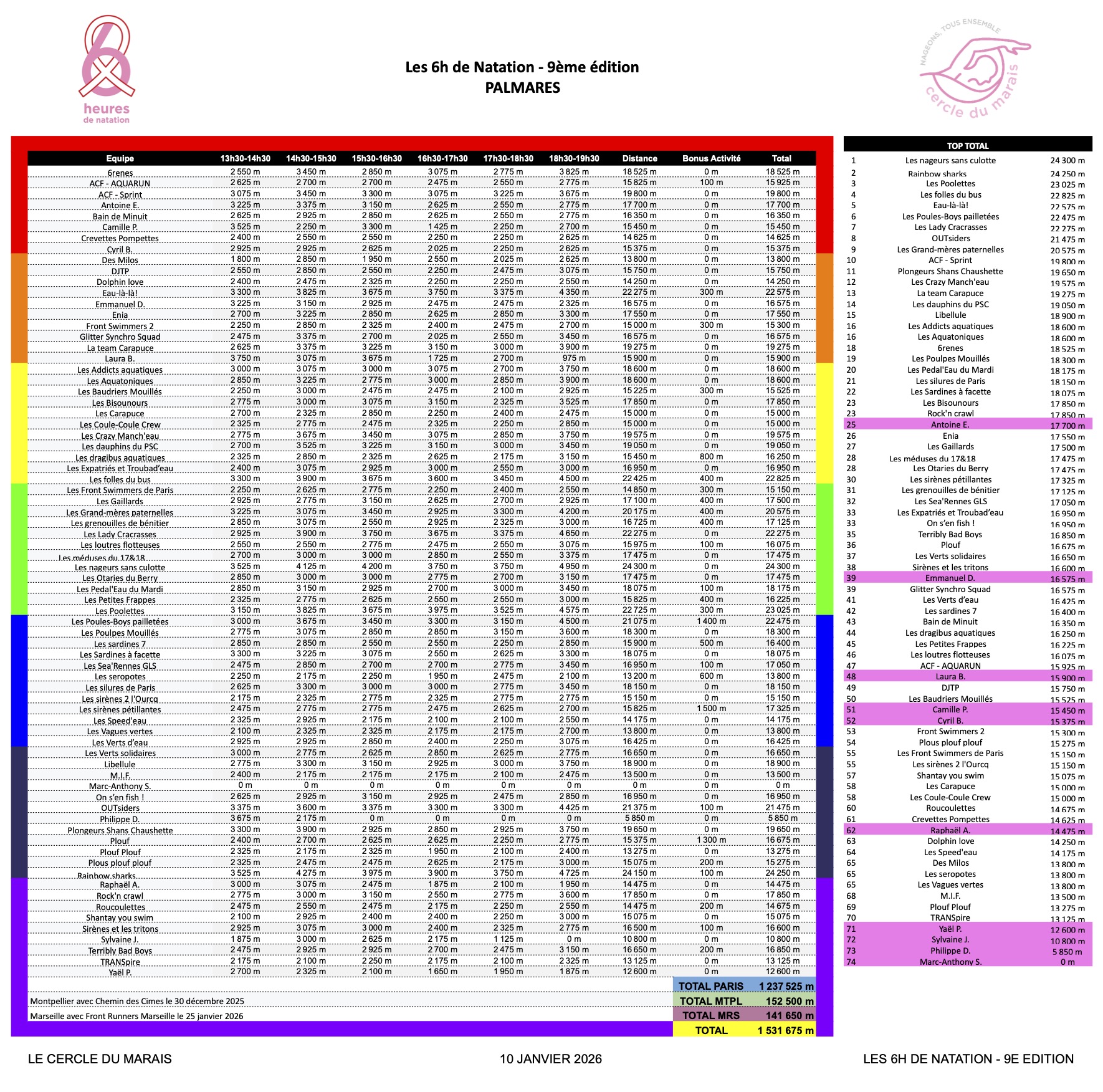 Ce sont plus de 1000 personnes qui ont participé à la 9e édition des 6h à Paris, avec un record de 1237 km nagés, les 6h avaient également lieu à Montpellier et à Marseille avec 152 km et 141 km ce qui nous amène au total impressionnant de 1530 km nagés Retrouvez le palmarès de cette édition exceptionnelle ICI.